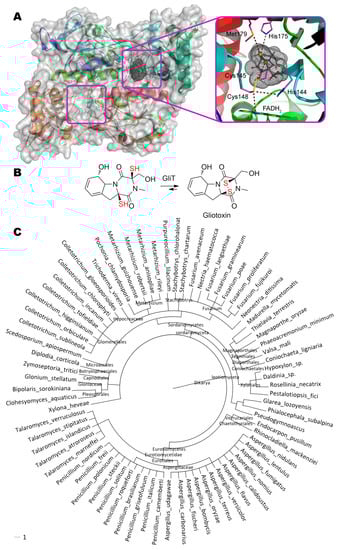 (A) Structure of gliotoxin oxidoreductase GliT (PDB 4ntc) containing gliotoxin in its active center, and (B) scheme of substrate conversion with GliT. Position and geometry of substrate binding was determined as described early. (C) Phylogenetic tree of microorganisms possessing homologous enzymes found with BLAST.