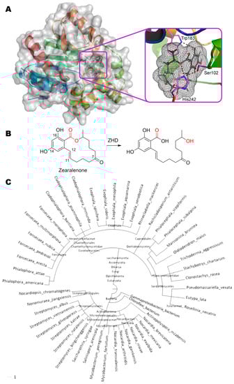 (A) Structure of zearalenone hydrolase ZHD (PDB 3wzl) containing zearalenone in its active center, and (B) scheme of substrate conversion with ZHD. Position and geometry of substrate binding was determined as described early. (C) Phylogenetic tree of microorganisms possessing homologous enzymes found with BLAST.