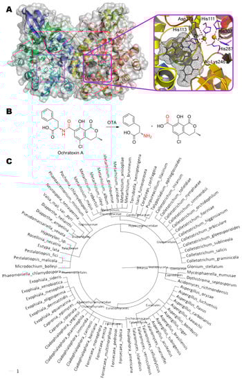 (A) Structure of ochratoxinase OTase (PDB 4c5y) containing ochratoxin A in its active center, and (B) scheme of substrate conversion with OTase. Position and geometry of substrate binding was determined as described early. (C) Phylogenetic tree of microorganisms possessing homologous enzymes found with BLAST.