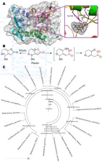 (A) Structure of enzyme PGUG containing patulin in its active center, and (B) scheme of substrate conversion with PGUG. Amino acid sequence was obtained from GenBank EDK41095.2 and folded using I-TASSER server. Position and geometry of substrate binding was determined as described early. (C) Phylogenetic tree of microorganisms possessing homologous enzymes found with BLAST.