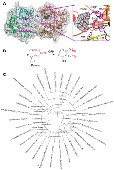 (A) Structure of organophosphorus hydrolase (PDB 1qw7) containing patulin in its active center, and (B) scheme of substrate conversion with organophosphorus hydrolase. Position and geometry of substrate binding was determined as described early. (C) Phylogenetic tree of microorganisms possessing homologous enzymes found with BLAST.