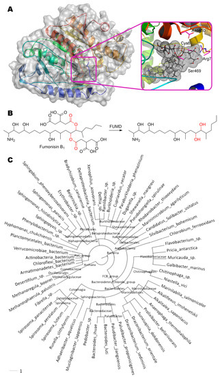 (A) Structure of enzyme FUMD containing fumonisin B1 in its active center, and (B) scheme of substrate conversion with FUMD. Amino acid sequence was obtained from UniProt D2D3B6 and folded as described early. Position and geometry of substrate binding was determined as described early. (C) Phylogenetic tree of microorganisms possessing homologous enzymes found with BLAST.