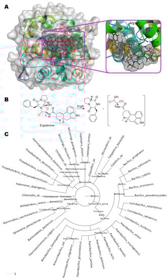(A) Structure of enzyme ErgA containing ergotamine in its active center, and (B) scheme of substrate conversion with ErgA. Amino acid sequence was obtained from [132] and folded as described early. Position and geometry of substrate binding was determined as described early. (C) Phylogenetic tree of microorganisms possessing homologous enzymes found with BLAST.