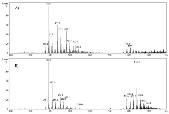 Full scan mass spectra of (A) ergocalciferol in ethanol/water (80/20, v/v), pH 7.4, potential 2 V and (B) ergocalciferol in acetonitrile/water (50/50, v/v), potential 1.2 V.