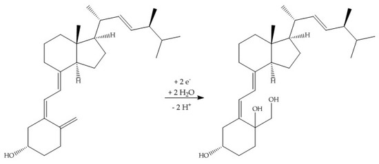Nevertheless, it can be assumed that an electrochemical oxidation took place. It was possible to simulate dehydrations, hydroxylations, and methoxylations or ethoxylations, respectively. The results from Nallbani et al., which also deal with a characterization of those oxidation products, showed that the electrochemical oxidation presumably takes place at the delocalized electron system at C8–C19. A reaction with the less reactive aliphatic chain (C20–C27) would be unlikely [24]. Filik et al. suspected the generation of 25-hydroxycalciferol [25]. On the other hand, the results from the present study showed the generation of another metabolite. However, the chemical structure has to be verified. To identify and characterize the generated oxidation products, further NMR experiments is recommended, needing far higher amounts of the single compounds.