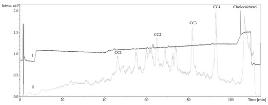 The total ion chromatogram and the UV-chromatogram of cholecalciferol (Figure 6) were similar to those of ergocalciferol. They showed many signals that represent the generated oxidation products. The quasimolecular ions of the four oxidation products of cholecalciferol (CC1–CC4) were each 12 Da higher than EC1–EC4. This can be explained by the 12 g/mol difference of the molar masses of ergocalciferol and cholecalciferol.