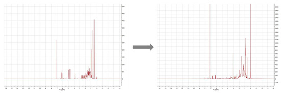 However, this technique is limited by the semi-preparative HPLC system that was used, which was not able to separate and enrich the amount of the numerous oxidation products that could be investigated further. This can be explained with the structural similarities and the little differences of the products (e.g., trans or cis double bonds). Only a 1H-NMR spectrum of an oxidation product in a methanol solution indicated that the electrochemical oxidation involved a reaction at the double bond of the conjugated triene system. The singlet signal of the two protons at position C19, which were to be expected for chemical shifts between 4 ppm and 6 ppm, were no longer present in the spectrum (Figure 7).