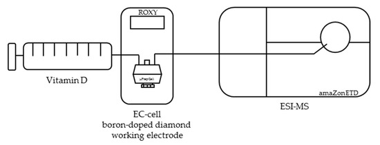 The electrochemical oxidation of vitamin D was performed using an electrochemical system (ROXY™, Antec Leyden B.V., Leiden, The Netherlands), which was equipped with a preparative thin-layer cell (µ-PrepCell, Antec Leyden B.V., Leiden, The Netherlands). The thin-layer cell consisted of a boron-doped diamond working electrode, a titanium counter electrode, and a palladium/hydrogen reference electrode. The electrochemical potential was controlled using a ROXY™ potentiostat (Antec Leyden B.V., Leiden, The Netherlands). A schematic of the instrumental setup is shown in Figure 9.