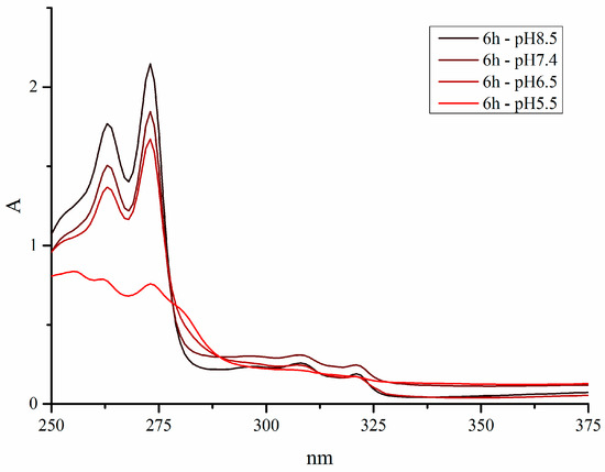 The stability under physiological conditions is a vital part of the process of developing a new drug. Additionally, N-donor leaving groups equip piano-stool complexes with an elegant pH-switch. Theoretically, they can be protonated at lower pH values, as found in the extracellular matrix of the tumor tissue, and are therefore cleaved off. The resulting aqua complex is highly reactive and able to interact with biological targets. To put this theory to the test, the stability of complexes 1a–g was investigated at different pH values, i.e., 5.5, 6.5, 7.4, and 8.5. Spectra were recorded over a period of 24 h, with 40 µM solutions (1% DMSO in water) in the range of 250–700 nm. The chosen pH values represented the physiologically relevant conditions; a pH value of 8.5 is the highest pH found in the human body (in the duodenum), a pH value of 7.4 is the average pH of human blood, and a pH value of 6.5 is the pH found in the extracellular matrix of solid tumors [30].