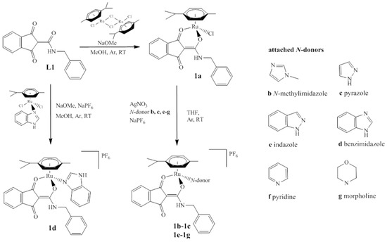 All solvents were purchased from commercial sources and distilled prior to use. 1-Methylimidazole (99%, Sigma-Aldrich, Vienna, Austria), pyrazole (98%, Sigma-Aldrich, Vienna, Austria), benzimidazole (≥98%, Sigma-Aldrich, Vienna, Austria), indazole (≥98%, Polivalent95, Chisinau, Moldavia), pyridine (>99%, Fisher Scientific, Vienna, Austria), morpholine (≥99.5%, Aldrich, Vienna, Austria), silver nitrate (≥99.5%, Aldrich, Vienna, Austria), and sodium hexafluorophosphate (95.5%, Fisher Scientific, Vienna, Austria) were purchased and used without further purification. 2-((Benzylamino)(hydroxy)methylene)-1H-indene-1,3(2H)-dione, [(Chlorido)(1,3-dioxo-κO1-1H-inden-2(3H)-ylidene)(benzylamino)methanolato-κO2)](η6-p-cymene)ruthenium(II) [26] (complex 1a), and [(dichlorido)(κN1-Benzimidazole)(η6-p-cymene)] ruthenium(II) [19] were synthesized as described elsewhere.