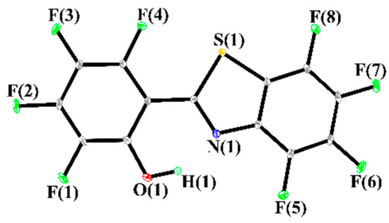 According to the X-ray diffraction data, the asymmetric unit of the H(SONF) compound contains two disordered independent molecules, which have close geometric parameters. Molecules have a practically flat structure. The dihedral angles between benzothiazole and hydroxyphenyl fragments are 1.09–7.35°. This feature is in excellent agreement with previously published non-fluorinated analogues [26,27,28]. Such conformation, similar to non-fluorinated analogues [26,27,28,29], is stabilized by an intramolecular hydrogen bond O(1)H(1)···N(1) [1.71(2) Å] (Figure 2).