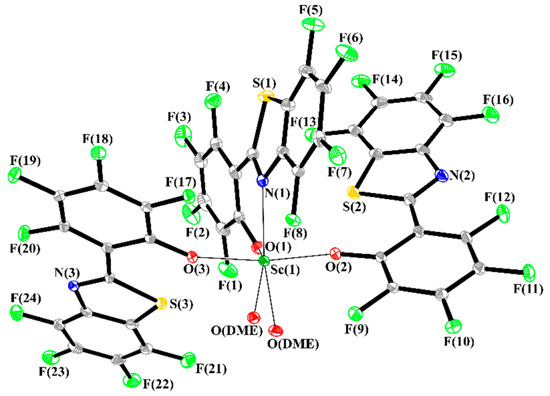 According to X-ray analysis, complex 2 contains three SONF anionic ligands and one neutral molecule, DME, coordinated to the Sc atom, which has a distorted pentagonal bipyramidal environment (Figure 3). It should be noted that two ligands in 2 are bonded to the Sc(1) atom monodentately via oxygen atoms. The sulfur atoms of the benzothiazolyl fragments in these ligands are directed towards the metal atom but do not interact coordinately. In turn, the third SONF ligand coordinates to the Sc(1) atom bidentately via oxygen and nitrogen atoms. Such coordination was previously observed in a complex of yttrium with a 3-(2-benzothiazol-2-yl)-2-naphtholate ligand [30]. Analysis of Sc(1) coordination environment has shown the existence of the intramolecular Sc(1)···F(8) interaction, which is 2.782 Å (Figure 3).