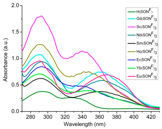 It is known that 2-(2-hydroxyphenyl)benzothiazole and respective benzothiazolate ligands can exist in enol and keto forms, which affects their molecular structure and electronic absorption spectra [34,38,39]. This feature is also inherent in perfluorated analogues, which is confirmed by their electronic absorption spectra in THF solutions. The spectra consist of three bands in the regions 250–310, 320–370, and 380–420 nm (Figure 5) and are assigned to intraligand π–π* transitions. Their relative intensity reflects the ratio of tautomeric forms in the compounds [34,39]. The spectra of complexes also contain two bands caused by intramolecular π–π* transitions. The observed bathochromic shift of the long-wavelength band in the spectra of the Nd, Sm, Eu, and Gd complexes compared to the Sc, Ho, Er, and Yb spectra is probably explained by some changes in the geometry of the coordination environment of metal ions upon transition from small to large Ln3+ ions.