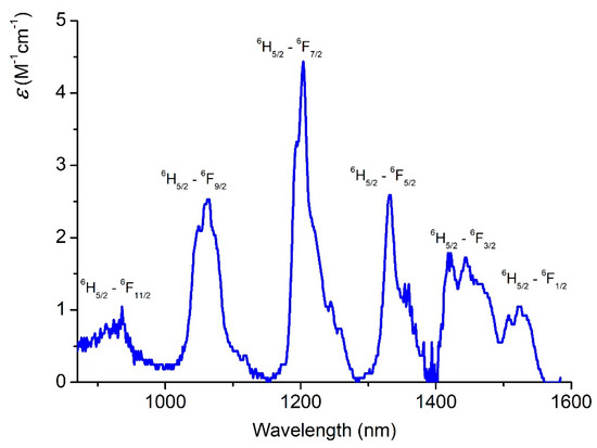 To evaluate the calculated luminescent lifetime of the obtained complexes using the Judd-Ofelt theory, the spectrum of the solutions of compound 4 in THF in the NIR region was recorded using the compensatory subtraction method [40] (Figure 6). The spectrum consisted of six peaks assigned to f-f transitions from the ground 6H5/2 state to the excited 6FJ (J = 11/2, 9/2, 7/2, 5/2, 3/2, 1/2) and 6H15/2 energy levels (transitions from 6H5/2 to states 6F3/2 and 6H15/2 are combined in a single spectral peak).