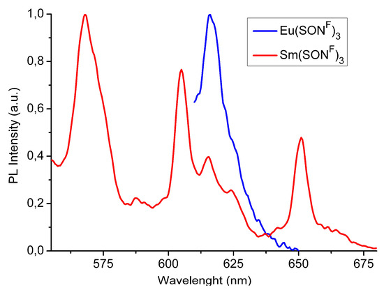 The T1 level of the SONF ligand equal to 20,060 cm−1 was determined by the low-temperature photoluminescence spectrum of the gadolinium complex (Figure S4), by the position of the short-wave edge of the phosphorescence band, which is taken as the value corresponding to the 0–0 transition [44,45]. This position of the triplet level suggests that ligands can be an effective sensitizer for the PL of Ln3+ ions emitting in the visible region. According to this assumption, it has been found that the PL spectra of the Sm and Eu complexes, along with the bands of SONF ligands, display the bands of the respective metal (Figure 8).