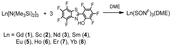 The search for new efficient photo- and electroluminophores still remains an urgent task. Near infrared (NIR) luminescence, especially from lanthanide complexes, such as Nd3+ and Yb3+, has emerged as an area of paramount interest due to its pioneering technological applications in fields ranging from bioimaging to optical communications [1,2,3,4,5,6,7]. However, since f-f transitions are largely forbidden, the ligand-free Ln3+ ions have very low molar absorption coefficients and hence the direct excitation of lanthanide ions always leads to modest or low luminescent intensities [8,9,10,11,12,13,14,15]. This problem can be solved with the help of organic ligands, which harvest excitation energy and transfer it to the attached Ln3+ ion, significantly increasing its luminescence (antenna effect) [16,17,18,19]. One of the most promising harvesting compounds is the benzothiazolate ligand (SON). The lanthanide complexes with SON ligands display excellent photo- and electroluminescence properties [20,21]. All these compounds, except for the scandium complex, have a dimeric structure, and all the ligands are bidentate [20,21]. However, the high energy of their triplet level does not coincide too much with the first excited state of NIR-luminescent ions Ln3+ [22]. As is known, the replacement of C–H bonds in a ligand with low energy C–F oscillators is able to lower the vibrational energy of the ligand and thereby enhances the luminescence intensity of the Ln3+ ions, especially for NIR emitting metals [23,24]. This effect is well manifested in Zn complexes with fluorinated benzothiazolate ligands, which show intense photoluminescence [25]. Following this approach, in search of new effective phosphors, we synthesized complexes of rare-earth metals based on perfluorinated benzothiazolate ligands (SONF) and studied their structure and photoluminescent (PL) properties.
