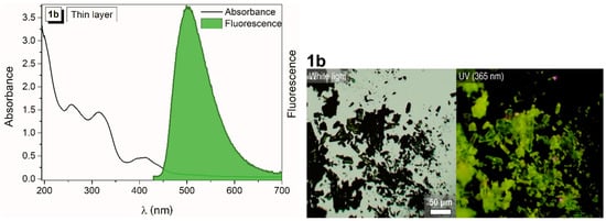 Absorption and emission spectrum of 1b in the thin solid film layer on the quartz substrate (λEXC = λA) (left) and micrograph of synthesized azafluorenone 1b under visible (white) light and UV light (365 nm). The micrograph illustrates the crystals and fluorescence of 1b in thin solid film (right).