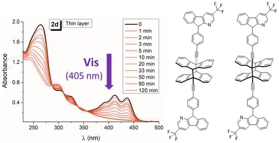 Carboline 2c exhibited the aggregation-caused quenching (ACQ) phenomenon, and its fluorescent quantum yield significantly decreased from approximately 0.8 in solution to the value of 0.2 in the thin solid film (Table 3). As expected, luminophore 2d with a rigid phenylethynyl spacer absorbed light in the violet region of the electromagnetic spectrum due to increased conjugation of anthracene with the phenylethynyl linker and exhibited really strong emission in the solid state with almost 100% efficiency (ΦF ~ 1; Table 3). Interestingly, when irradiated with visible (Vis) light of a 405-nm wavelength, luminophore 2d in thin solid film underwent a photochemically-allowed [4πs + 4πs] dimerization through anthracene subunits, with the typical decrease of the long-wavelength absorption band in the Vis region and the appearance of a new strong light anthracene dimer absorption around 250 nm (Figure 4) [29]; contrary to the Diels–Alder dimer of 9-phenylethynylanthracene with the typical vibrational structure of the anthracene absorption band between 350 and 400 nm [30]. This Vis light-driven dimerization phenomenon in the solid state and its back thermally-driven reaction could be important for reversible optical writing and data storage applications [31,32,33]; however, the switching system needs deeper investigation, which is out of the scope of this paper. Bi- and tri-exponential fluorescence decay behavior in the solid films versus mono-exponential fluorescence decay in both polar and non-polar solutions, together with evident bathochromic shift of the emission maximum, clearly indicated aggregation of the carbolines 2a–2e in the solid state (Table 3, Figure 5).