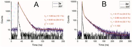 Fluorescence decay profiles of the carbolines 2e (A) and 2d (B)in thin solid films obtained using an excitation wavelength of 340 nm and 402.8 nm, respectively (monitored at emission maximum; IRF, instrument response function).