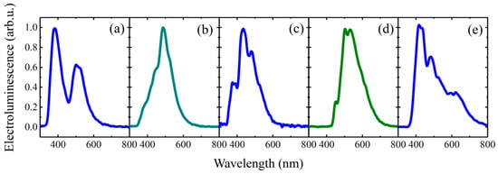 The electroluminescence (EL) spectra of fabricated OLED devices with carboline 2a–2e emissive layers are depicted in Figure 7. It should be noted here that the EL spectra were independent of the applied voltage, and only intensity increased proportional to the current density. Hence, all plotted spectra were normalized for better comparison. Even though the devices were not stable for long-period measurement, the devices exhibited reproducible characteristics, and spectra were identical for the group of fabricated devices (eight devices for each derivative).