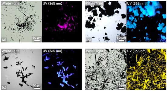 Micrographs depicted in Figure 8 illustrate crystals and photoluminescence. Obviously, the broad emission spectra of some derivates led to the white-like emission even though the blue regions were present there. Since the derivate 2d did not exhibit blue emission, the color appeared yellowish.