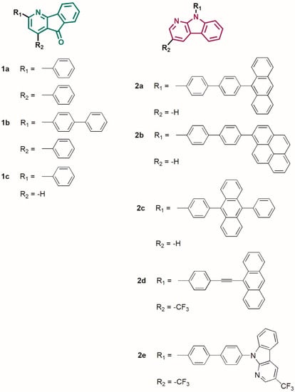 Thermal stability is one of the key parameters for molecules used in organic electronics. As shown in Figures S7–S14, the studied 4-azafluorenone and α-carboline derivatives exhibited sufficient thermal stability, which ranged from 284 °C to 392 °C for 4-azafluorenones 1a–1c and from 366 °C to 456 °C for α-carbolines 2a–2e, respectively (the thermal stability was determined from the extrapolated onset temperature To).