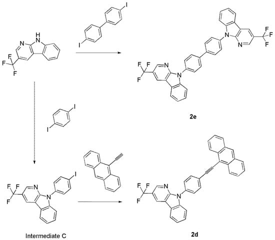 A portion of 3-trifluoromethyl-9H-pyridino[2,3-b]indole (605 mg, 2.50 mmol, 2.5 mol eq.), 4,4′-diiodobiphenyl (507 mg, 1.0 mmol, 1 mol eq.), K3PO4(5.31 g, 25 mmol, 20 mol eq.), CuI (80 mg, 0.5 mmol, 0.4 mol eq.), and trans-1,2-diaminocyclohexane (286 mg, 0.30 mL, 2.5 mmol, 2 mol eq.) were suspended in dry toluene (36 mL) under an argon atmosphere, and the mixture was stirred at 110 °C for 18 h. After finishing the reaction, the mixture was filtered through Celite and washed with DCM. The crude product was purified by FLC (CombiFlash, 120 g SiO2, 75 mL/min, Hex/DCM 3:1 to 2:3 v/v).
