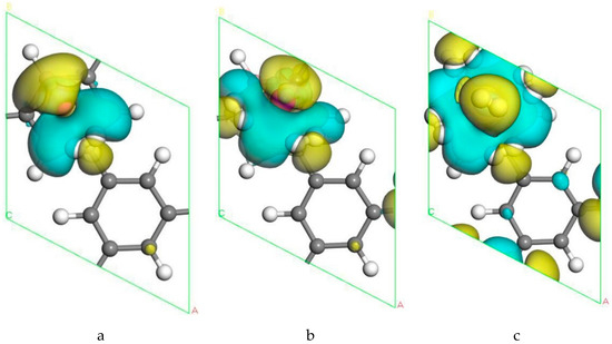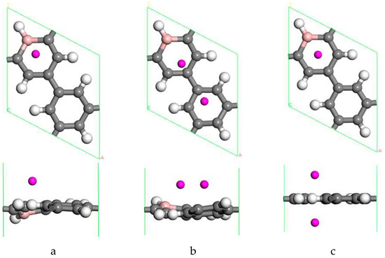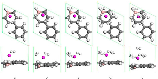 The structure of two Sc atoms on both sides of B-PG was also studied to open up enough space to adsorb H2 molecules. Each transition metal atom is an active adsorption site. The double-sided modification of B-PG by the transition metal atom can raise the hydrogen storage area. On account of Figure 2a, the second Sc atom had four adsorption sites on the opposite side of the B-PG, including two carbon ring centers, C-C bridge site, and half C ring pore sites on the opposite side. The most stable adsorption structure was obtained as shown in Figure 2c. The average binding energy of two Sc atoms was −4.085 eV, larger than that of two Sc atoms in the clean PG system. Therefore, the presence of B atoms in PG prevented the Sc atoms from aggregating. In addition, it can be seen from Figure 2a,b that the B-PG system underwent slight deformation after Sc atoms were adsorbed. However, Figure 2c did not undergo any deformation, which was related to the symmetric distribution of Sc atoms.