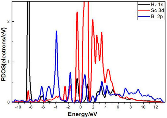 To further investigate the combined effects of the B atom and Sc atom on H2 molecule adsorption, the PDOS of one H2 molecule adsorbed in a single Sc-modified B-PG system was analyzed (as shown in Figure 6). From 1.0 to 0.0 eV, there were overlapping peaks between B 2p orbit, Sc 3d orbit and 1s orbit of the H2 molecule, which means that B and Sc both played a role in H2 adsorption. In addition, it can be observed that the 2p orbit of B atoms overlapped with the 3d orbit of Sc atoms in most energy intervals, indicating that there was a strong interaction between B and Sc, which further explained why Sc had a higher binding energy in the B doping system.