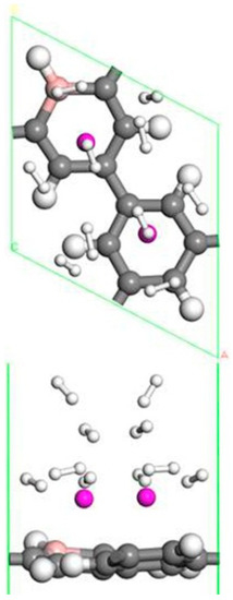 The B-PG system with two Sc atoms modified on one side can adsorb 10 H2 molecules. The optimized geometry structure is shown in Figure 8. The average adsorption energy of the B-PG system was about −0.339 eV/H2 with the hydrogen storage capacity (7.73 wt.%). Because the adsorption energy of two Sc atoms on B-PG was larger than their cohesion energy, the distance between them was close without bonding.