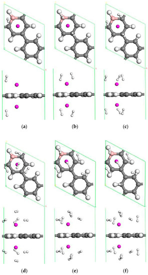 Optimized geometries of two Sc double-sided modified B-PG systems with two H2 molecules (a), four H2 molecules (b), six H2 molecules (c), eight H2 molecules (d), ten H2 molecules (e), and twelve H2 molecules (f) adsorbed.