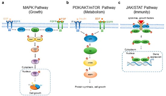 Signaling pathways selected for the evaluation of the biological effects of essential oils. (a) The mitogen-activated protein kinase (MAPK) signaling pathway that regulates cell growth and differentiation. EGF—epidermal growth factor; EGFR—epidermal growth factor receptor; FGF—fibroblast growth factor; FGFR—fibroblast growth factor receptor; SOS—guanine nucleotide exchange factors; RAS—small GTPases; serine/threonine-specific protein kinases; MEK1/2—mitogen-activated protein kinase kinase; ERK1/—extracellular signal-regulated kinase 1/2. (b) The pI3K/Akt/mTOR signaling pathway that regulates cell metabolism. IR—insulin receptor; pI3K—phosphoinositide 3-kinase; Akt—protein kinase B; mTOR—mammalian target of rapamycin; 4EBP1—eukaryotic translation initiation factor 4E-binding protein 1. (c) The JAK/STAT signaling pathway that regulates the cellular immune response. JAK—Janus kinase; STAT—signal transducer and activator of transcription protein. P—phosphate group; solid arrows—direct regulation; dashed arrows—indirect regulation via one or more intermediates. The right to use the DNA double helix illustration was purchased with the standard image license (honglouwawa/shutterstock.com).