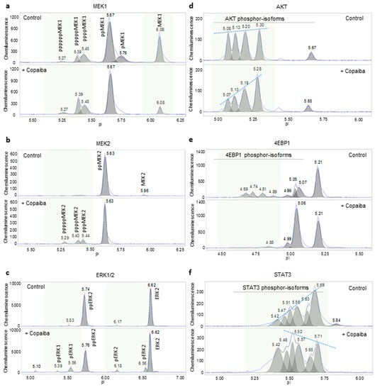 Biological effects of copaiba essential oil on cellular signaling pathways. Copaiba essential oil positively regulated the MAPK signaling pathway by increasing MEK1 phosphorylation (a), MEK2 phosphorylation (b), and ERK1/2 phosphorylation (c). Copaiba essential oil negatively regulated the pI3K/Akt/mTOR signaling pathway by decreasing the levels of phosphorylated Akt (d) and 4EBP1 (e). Copaiba essential oil positively regulated the JAK/STAT signaling pathway by increasing the level of phosphorylated STAT3 (f). Shaded backgrounds highlight areas where substantial changes in the levels of protein isoforms were observed. Dashed lines connect peak intensities to highlight changes in the levels of the phosphorylated Akt and STAT3 isoforms following the treatment of HepG2 cells with copaiba essential oil. CD1 was used for these assessments.