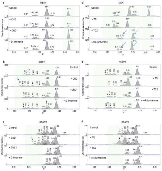 Assessment of the quality of mandarin and turmeric essential oils. (a–c) Phosphorylation of MEK1 (a), 4EBP1 (b), and STAT3 (c) observed following the treatment of HepG2 cells with mandarin essential oils CND, CNC1, and D-limonene. (d–f) Phosphorylation of MEK1 (d), 4EBP1 (e), and STAT3 (f) observed following the treatment of HepG2 cells with turmeric essential oils TD, TC2, and AR-turmerone. D-limonene and AR-turmerone are the principle components of mandarin and turmeric essential oils, respectively. Shaded backgrounds and blue arrows highlight areas where substantial changes in protein isoforms were observed following the treatment of HepG2 cells with essential oils.