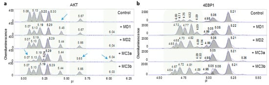 Assessment of the consistency of Melissa essential oils. Levels of phosphorylated Akt (a) and 4EBP1 (b) isoforms observed following the treatment of HepG2 cells with four Melissa essential oils: MD1, MD2, MC3a, and MC3b. Blue arrows and shaded backgrounds highlight areas where substantial changes in protein isoforms were observed following the treatment of HepG2 cells with Melissa essential oils.