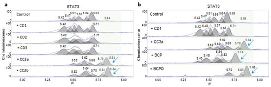 An assessment of the consistency of three copaiba essential oil samples from company D (CD1, CD2, and CD3) and two copaiba essential oil samples from company 3 (CC3a and CC3b) was also performed using nanofluidic protein PTM profiling. In general, the effects of copaiba essential oils from company D and company 3 on the MAPK and PI3K/AKT/mTOR signaling pathways were consistent and indistinguishable (Supplemental Figure S3a–c). These similarities were attributed to the presence of β-caryophyllene in all oil samples. β-caryophyllene is a principle component of copaiba essential oil that promoted MAPK signaling and inhibited PI3K/AKT/mTOR signaling (Supplemental Figure S3d–e). Interestingly, the effects of copaiba essential oils from company D on the JAK/STAT signaling pathway were drastically different from those of the oils from company 3. The CD1-3 treatment consistently increased the peak intensity of STAT3 with low pI values, which indicated increased STAT3 phosphorylation and increased activation of the JAK/STAT signaling pathway (Figure 5a). In contrast, CC3a and CC3b treatments consistently caused shifts in STAT3 toward higher pI values and induced the appearance of the unphosphorylated STAT3 isoform around pI 5.84. A β-caryophyllene treatment partially decreased STAT3 phosphorylation but did not completely reproduce the effects of CC3a and CC3b (Figure 5b). On the other hand, β-caryophyllene oxide mimicked the effects of CC3a and CC3b on STAT3 dephosphorylation and induced the appearance of unphosphorylated STAT3 around pI 5.84.
