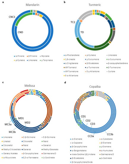 Chemical composition of essential oils. Chemical compositions of selected principle components of (a) mandarin essential oils CND and CNC1, (b) turmeric essential oils TD and TC2, (c) Melissa essential oils MD1, MD2, MC3a, and MC3b, and (d) copaiba essential oils CD1, CD2, CD3, CC3a, and CC3b.