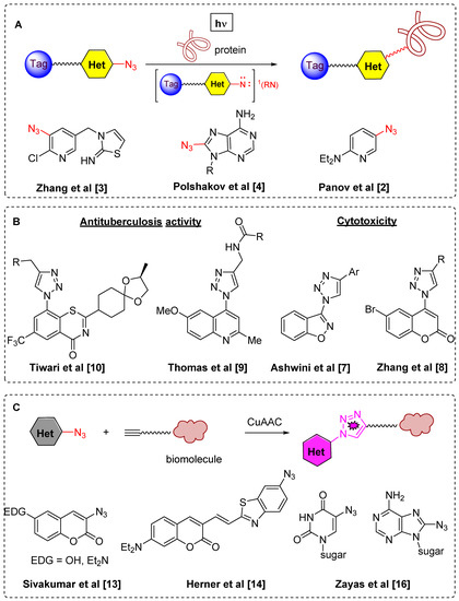 Recent areas of azidoheterocycles and triazolylheterocycles application–photoaffinity labeling (A); biologically-active compounds (B); fluorogenic azides (C).