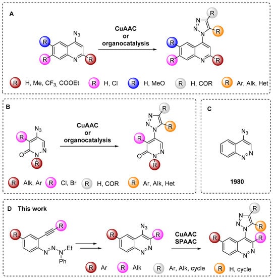 Among azidoheterocycles, azidoquinolines (Figure 2A) [17,18,19,20,21,22,23] and azidopyridazines (Figure 2B) [24,25,26,27,28] are well known, however only one known example of an azidocinnloline has been reported to date (Figure 2C) [29], while triazolylcinnolines still remain unknown. Taking into account that the cinnoline core can be found both in biologically active compounds with different types of activities [30,31,32,33,34] and in fluorescent materials [35,36,37,38,39,40], the development of a synthetic route towards azidocinnolines and triazolylcinnolines could lead to new biologically active molecules and interesting fluorescent probes.