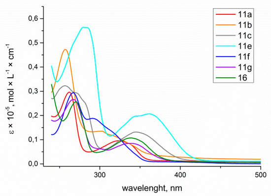 Absorption spectra of 4-triazolylcinnolines 11a−c, e−g, 16 solutions in THF, C = 1 × 10−5 mol/L.