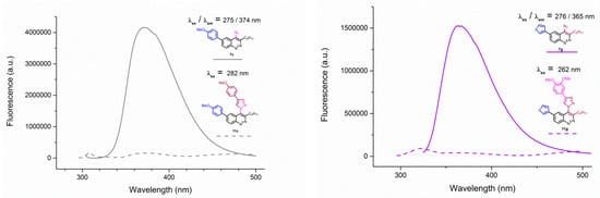 Emission spectra of 4-azidocinnolines/4-triazolylcinnolnes 7c/11c (left) and 7g/11g (right) solutions in THF, C = 1 × 10−5 mol/L.