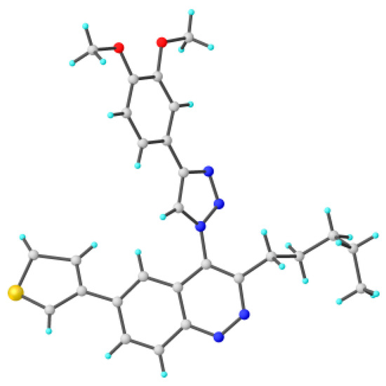 To explain the observed loss of fluorescence for triazoles, quantum chemical calculations for S0 states of the azide/triazoles pairs 7c/11c and 7f/11f were carried out. Geometry optimization was achieved using DFT calculations (B3LYP 6-311 + G(2d,2p)). The obtained data revealed that triazoles 11c and 11f are non-planar molecules: the triazole rings of both compounds lay out of the corresponding cinnoline plane (Table 2). X-Ray studies confirmed the non-planar geometry of triazole 11f in the solid state (Figure 6). The dihedral angle between the triazole and cinnoline rings was found to be 64.8°. Therefore, despite the extension of the conjugated chain, the non-planar geometry of 4-triazolylcinnolines could be one of reasons for the observed absence of fluorescence.