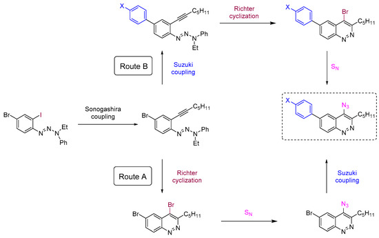 To reach the target 4-azido-6-arylcinnolines compounds we decided to use 4-bromocinnolines, which are synthetically accessible by the Richter cyclization in higher yields compared to corresponding chloro derivatives [54], while the bromine atom at the C4 position should be still reactive towards nucleophilic substitution. Firstly, two synthetic routes (A and B) have been proposed for target molecules (Scheme 1).