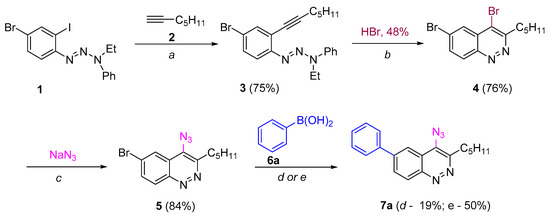 “Route A” seems to be more divergent and rational than “Route B”, because it allows for variations of the aromatic substituent during the last synthetic step. Therefore we chose “Route A” to start with. The Richter-type cyclization followed by the regioselective substitution of bromine atom with sodium azide in absolute DMF at the activated C4 position proceeded smoothly and did not affect the bromine atom at C6. Hence 4-azido-6-bromocinnoline 5 was obtained in good yield (Scheme 2). Next we tried to carry out the Suzuki coupling. Despite the fact that this transformation of substrates bearing aromatic azido groups is known, yields usually are low, because the whole process is accompanied by several side reactions that are common for both Suzuki coupling (homocoupling, reductive dehalogenation) and for azides (denitrogenative decomposition through nitrene intermediates and through the Staudinger reaction if phosphine ligands are present in the reaction mixture) [65]. Two types of conditions tested differed in the base (Na2CO3 or K3PO4) and solvents (toluene/dioxane/H2O or only dioxane, respectively) used (Scheme 2). The formation of the desired 4-azido-6-phenylcinnoline 7a as the main product was observed in both cases. However the isolated yields of the product 7a were found to be between low (conditions d, Scheme 2) to moderate (conditions e, Scheme 2). Moreover the Suzuki coupling proceeded with the formation of many byproducts that required time-consuming purification of the target azide by column chromatography. Therefore we turned to “Route B”.