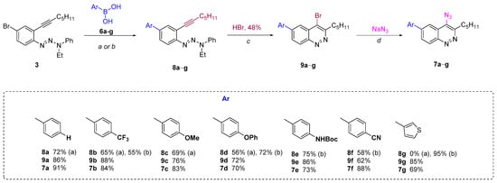 The Suzuki coupling of aromatic halotriazenes has been employed recently in the initial steps of the synthesis of hexadehydrotribenzo[12]annulene [66]. Similar conditions (Na2CO3, toluene/dioxane/H2O, 100 °C) for our substrates gave 4-phenyltriazene 8a in 72% yield. Applying next the Richter-type cyclization and nucleophilic substitution of bromine with sodium azide under the same conditions as for “Route A” enabled us to produce the final 4-azido-6-phenylcinnoline 7a in better overall yield (42%, “Route B”) (Scheme 3) compared to “Route A” (24%) (Scheme 2). Same routes?