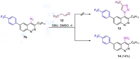 Next we checked the reactivity of azidocinnolines synthesized in reactions other than CuAAC used for the synthesis of 1H-1,2,3-triazole derivatives, like the enol-mediated organocatalytic synthesis of triazoles and strain-promoted alkyne-azide cycloaddition (SPAAC). Unfortunately, enol-mediated reaction [68] of azide 7b with propionic aldehyde catalysed by 1,8-diazabicyclo-[5.4.0]undec-7-ene (DBU) did not go as expected. The only isolated product was 4-aminocinnoline, which was presumably formed from the corresponding nitrene as an intermediate of azide decomposition (Scheme 5).