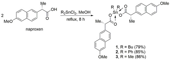 A solution of naproxen (0.46 g, 2.0 mmol) in MeOH (30 mL) was slowly added to a stirred solution of the appropriate dialkyltin chloride (1.0 mmol) in MeOH. The mixture was refluxed for 8 h, and then the solvent was removed under reduced pressure. The obtained solid obtained was recrystallized from MeOH to give the corresponding Sn(IV) complex (1–3).