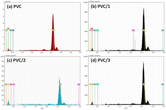 Previous reports have indicated that the most desirable photostabilization effect is obtained when additives are added to PVC at a concentration of 0.5 wt % [32,33]. Therefore, Sn(IV) complexes 1–3 (0.5 wt %) were mixed with PVC and the corresponding polymeric films (with a thickness of 40 μm) were produced. Energy-dispersive X-ray spectroscopy (EDX) can be used to obtain information about the elemental composition of the polymeric films. The EDX spectra of the PVC films (Figure 3) show strong absorption peaks corresponding to the chlorine atom of PVC. The EDX spectra of the PVC containing complexes 1–3 also show a new band that is related to the tin atoms of complexes 1–3. The assignment of the Sn peak is in agreement with previous reports [51].