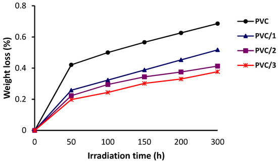 The weight loss of PVC during an irradiation process can be used as a measure of the level of photodegradation. Upon irradiation, a dehydrochlorination process occurs, resulting in the elimination of HCl from the PVC chains and the formation of polyene residues [52]. The PVC films containing complexes 1–3 were irradiated with a UV light for up to 300 h, and the PVC weight loss (%) was calculated using Equation (1), where W1 is the PVC weight before irradiation and W2 is the PVC weight after irradiation. The color of the PVC (blank) film and those containing Sn(IV) complexes 1–3 were almost identical before and after irradiation. The PVC films were colorless and darkened upon irradiation. After long term (300 h) of irradiation, the PVC films turned brown and less transparent,