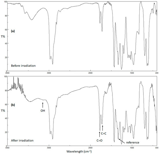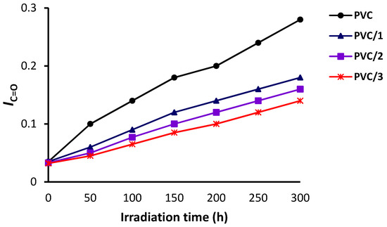 UV radiation alters the physical and chemical properties of polymers [53]. Photo-oxidation of PVC produces small fragments containing hydroxyl, carbonyl, and polyene moieties [53]. The intensities of the peaks corresponding to the hydroxyl (3500 cm−1), carbonyl (1722 cm−1), and polyene (1602 cm−1) groups in the FT-IR spectra of the PVC films can be monitored upon irradiation and compared with the intensity of a reference peak (1328 cm−1), which corresponds to the C–H bonds within the PVC chains. Such a comparison provides useful information about the rate of PVC photodegradation [54]. Therefore, the PVC films were irradiated, and the FT-IR spectra were recorded every 50 h up to 300 h. The index of each functional group (IS) was calculated from the absorbance of the functional group (As) and the reference group (Ar) using Equation (2),